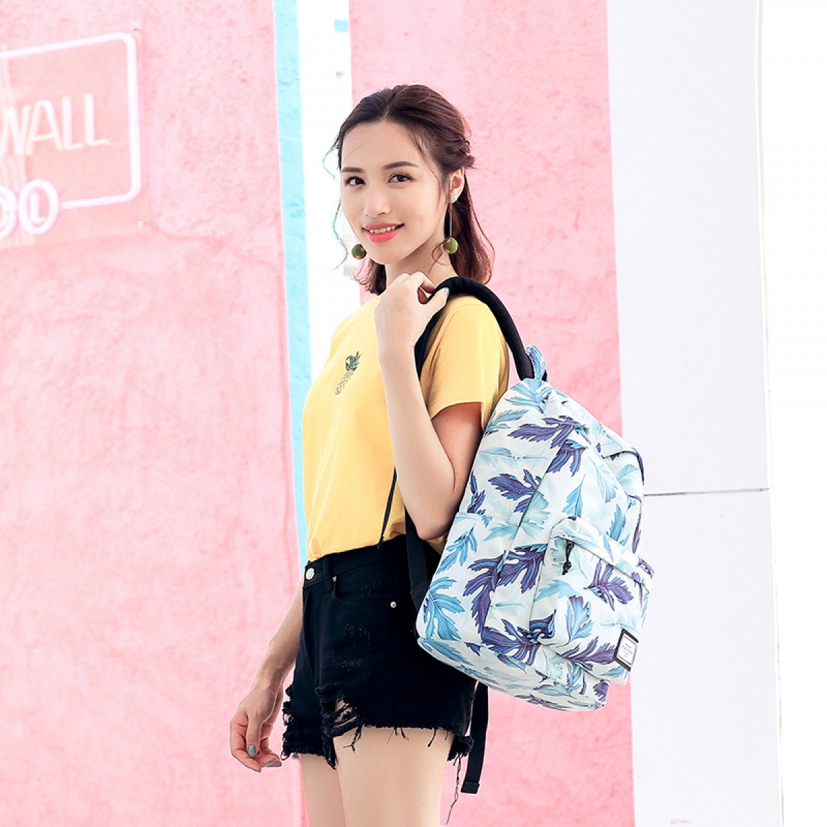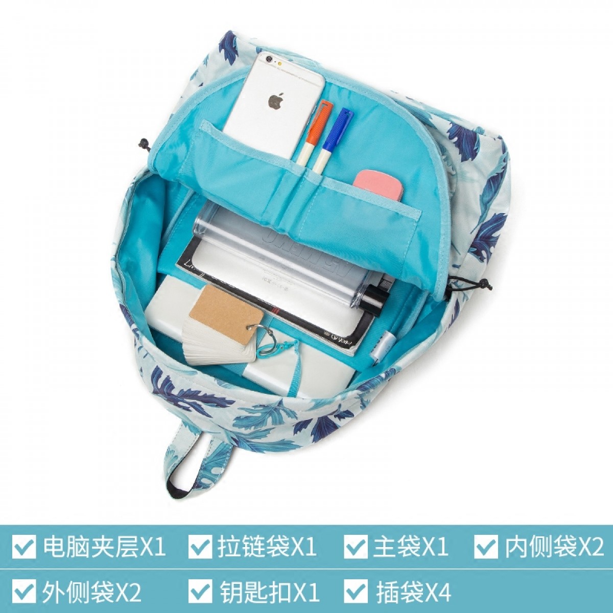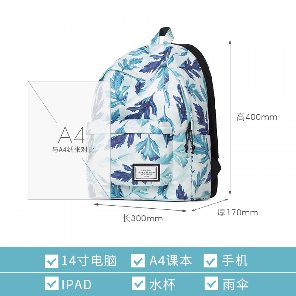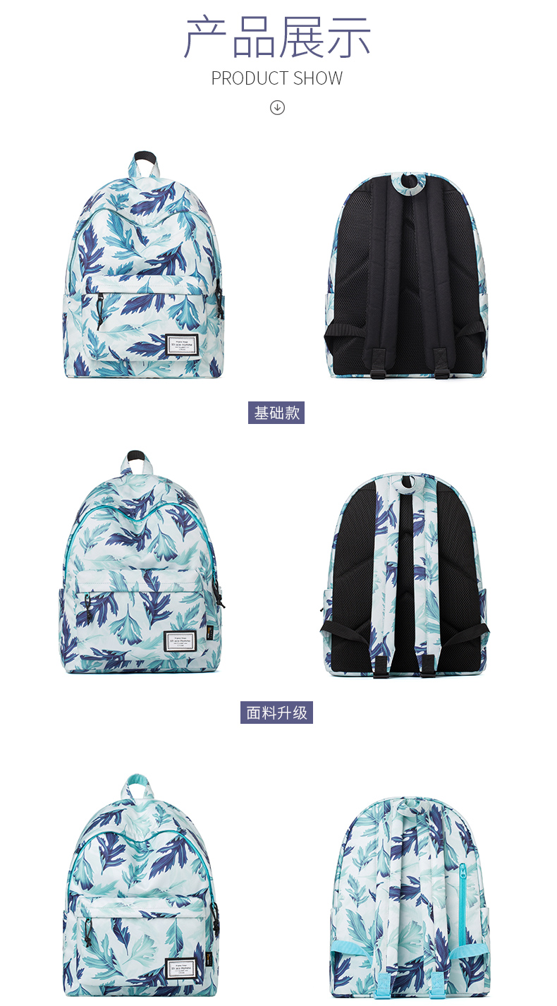 商品名称:Mr.ace Homme韩版双肩包女清新树叶印花书包大容量防水旅行背包男