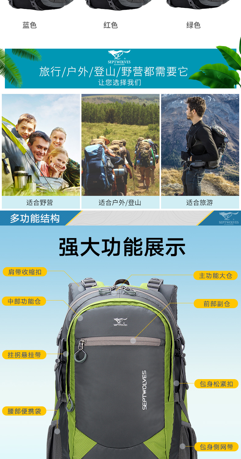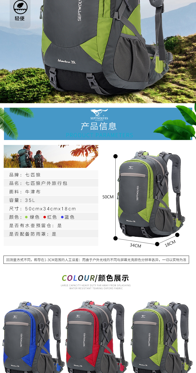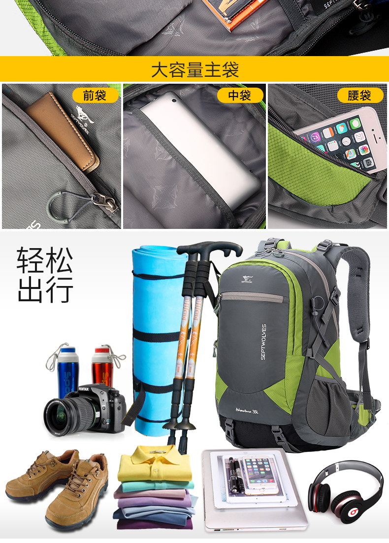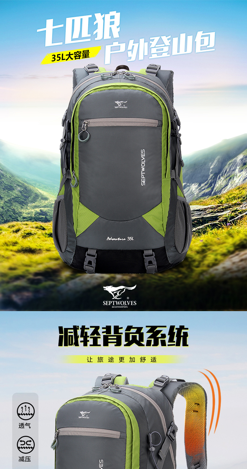 商品名称:七匹狼登山包双肩男 防水运动背包双肩包男女户外野营徒步旅行包