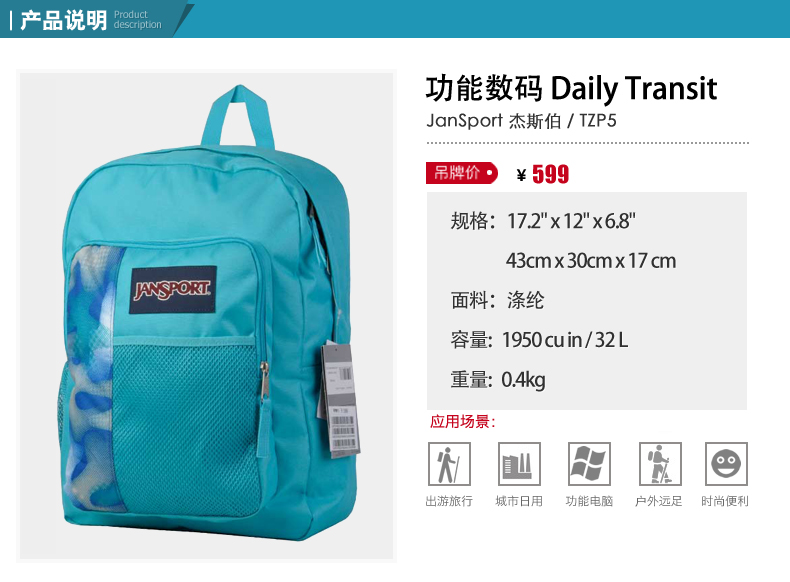 商品名称:JanSport/杰斯伯 15寸电脑男女双肩背包 TZP5 9QC