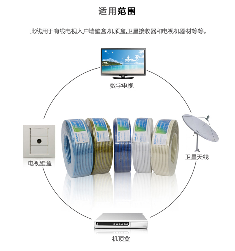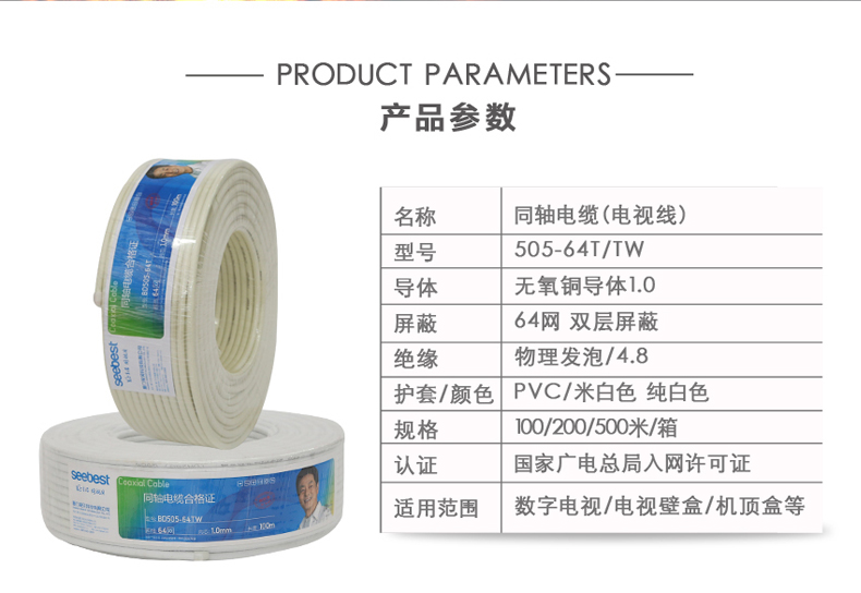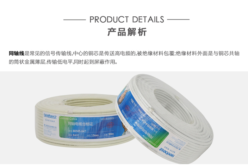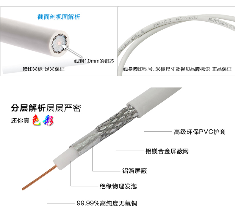 商品名称:视贝 同轴电缆高清有线电视线闭路线1.0内芯双层屏蔽闭路线 10米起 505-64T/TW
