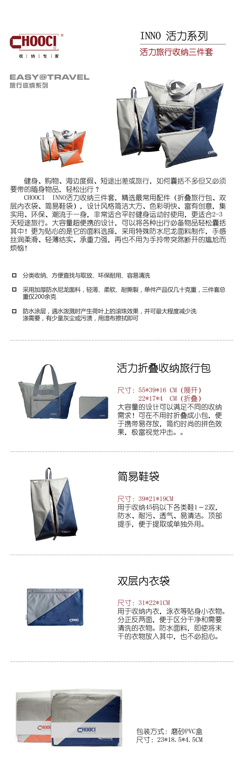 商品名称:CHOOCI 活力旅行收纳三件套 化妆洗漱内衣鞋袋 折叠轻便防水