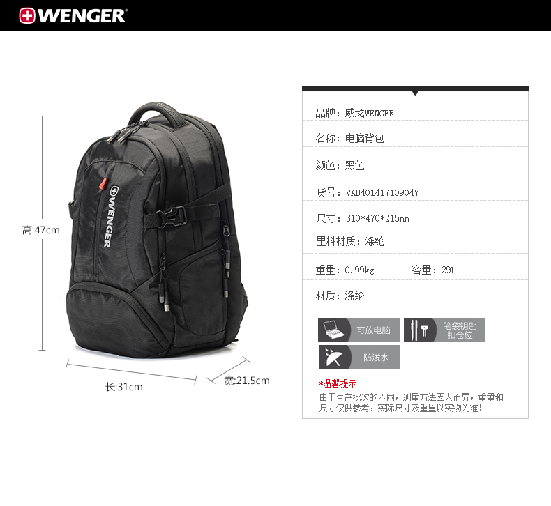 商品名称:Wenger/威戈 15寸电脑包旅行双肩背包男女VAB401417109047