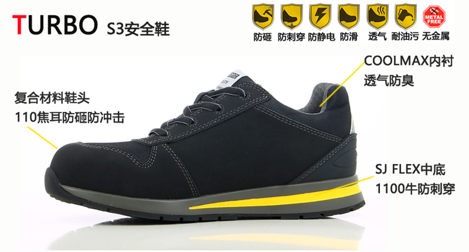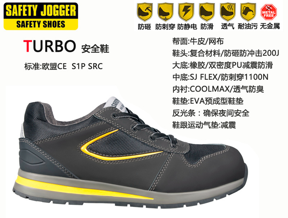Turbo是比利时Safety Jogger出品的新款时尚运动款安全鞋,防砸 防刺穿 防滑 防静电,正常运动鞋尺码,偏大半码,运动鞋穿41#,皮鞋穿40#,建议拍41#。牛皮帮面,塑钢鞋头,凯夫拉中底。