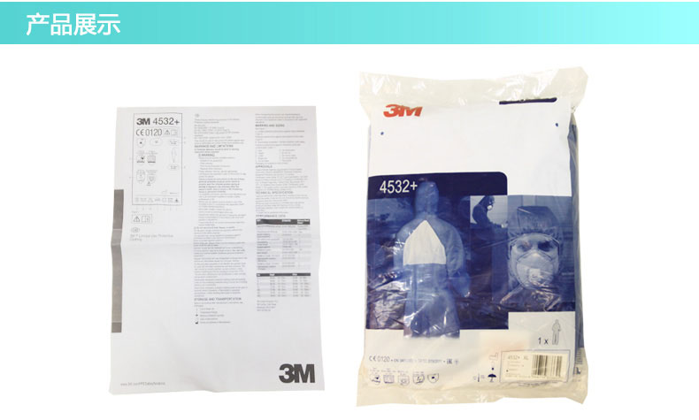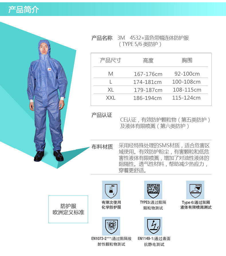 商品名称:3M 4532防护服 防辐射性颗粒物 防化服 喷漆服 防尘服 蓝色