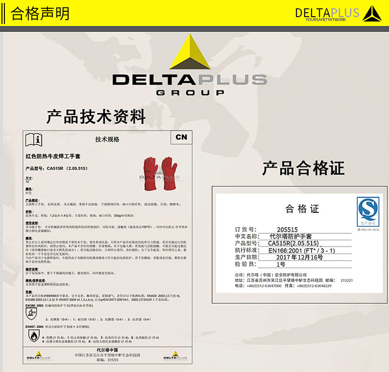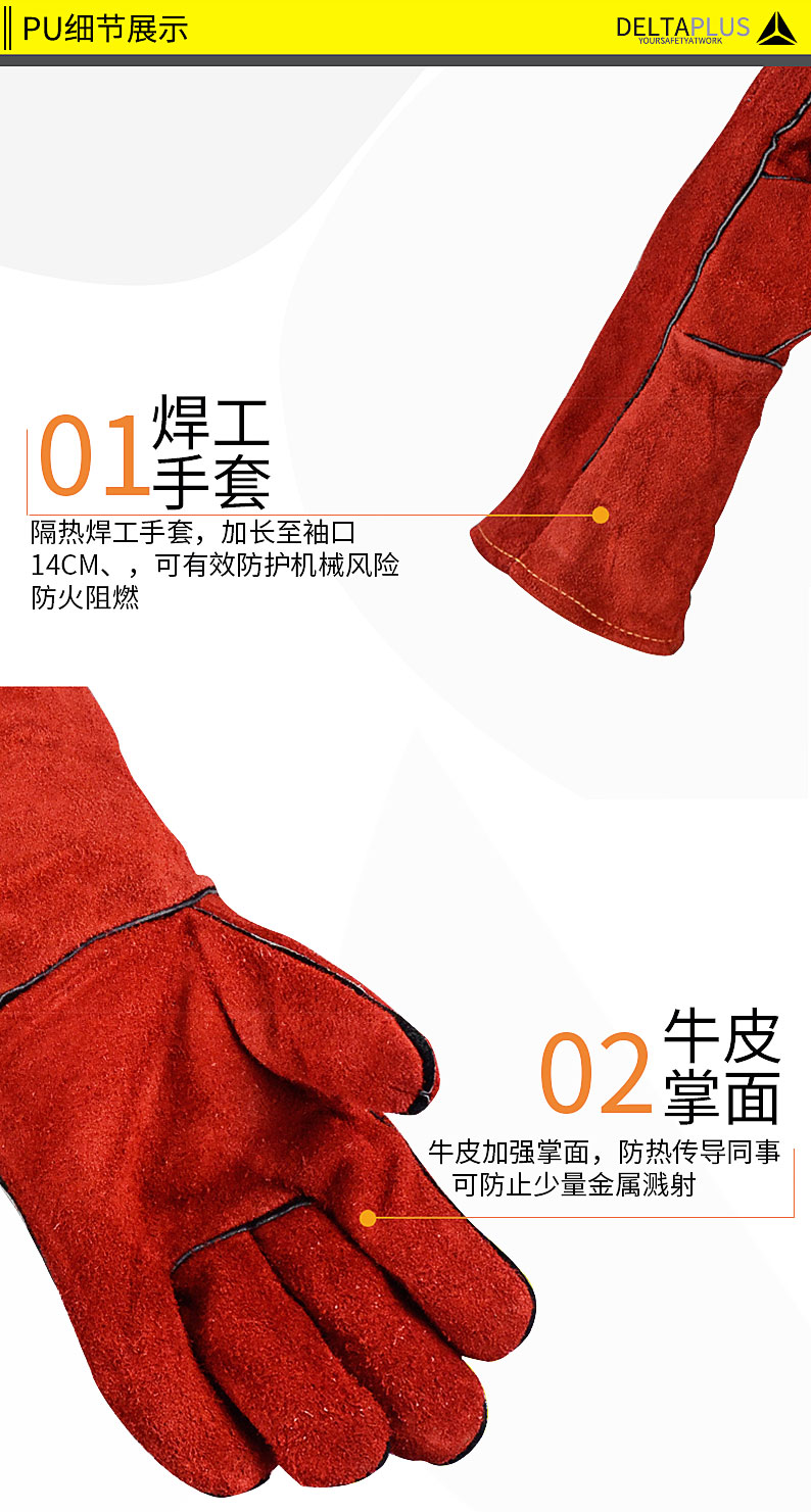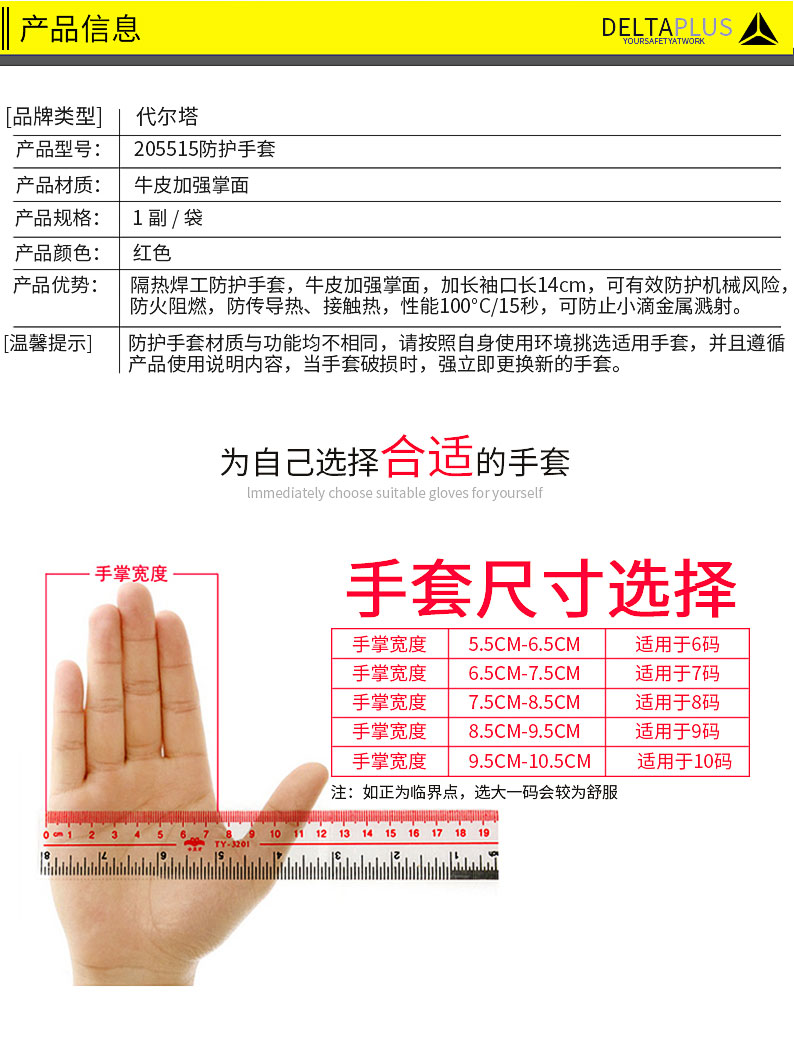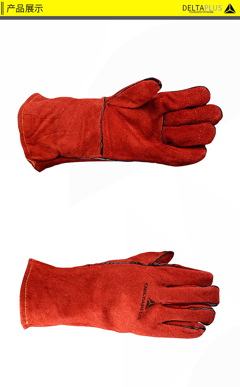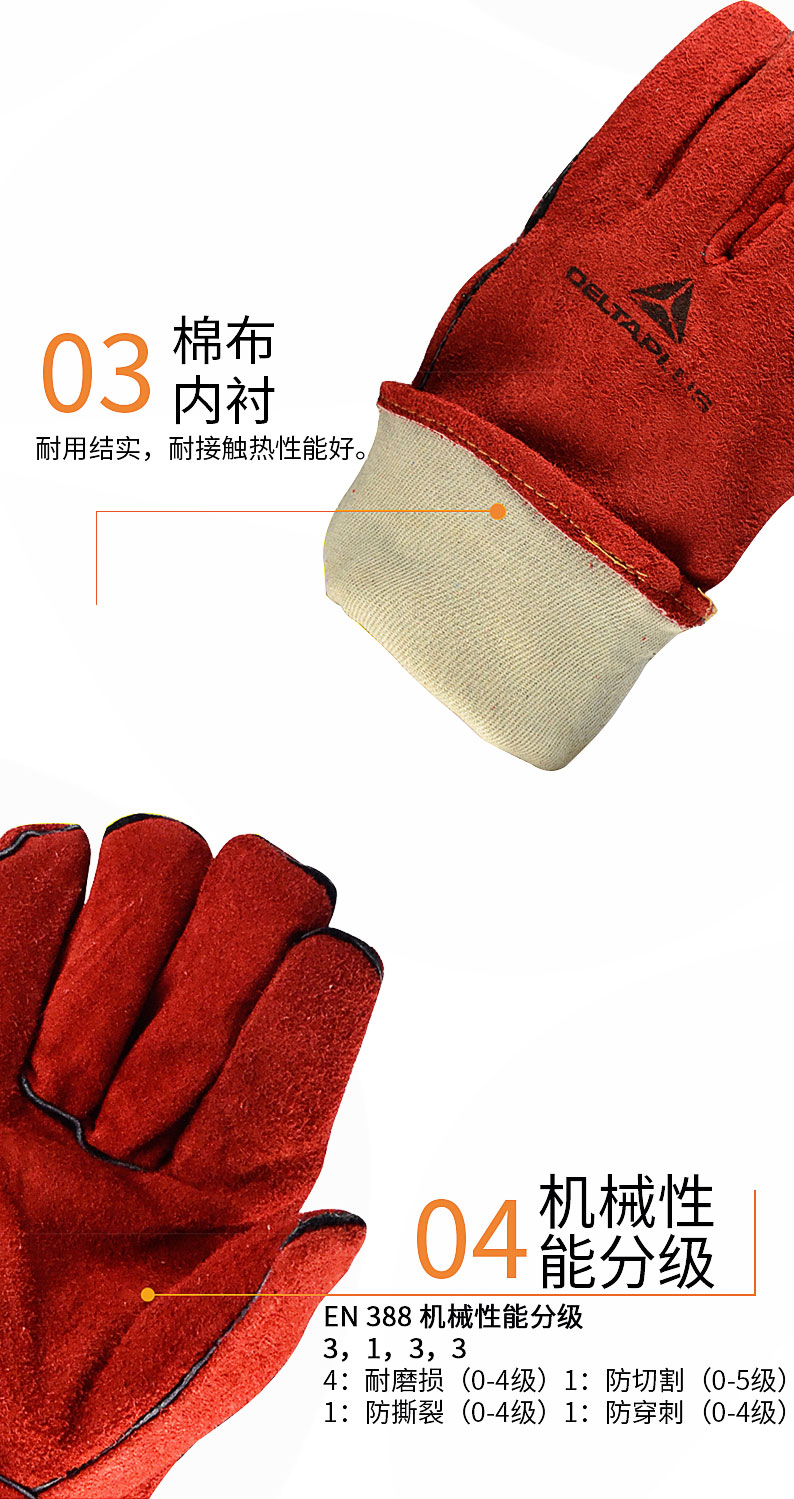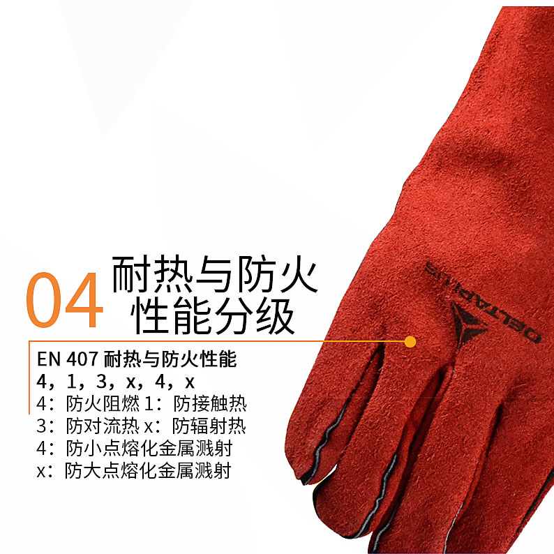 商品名称:代尔塔 205515防护手套电焊工手套隔热耐磨牛皮焊接防火阻燃手套