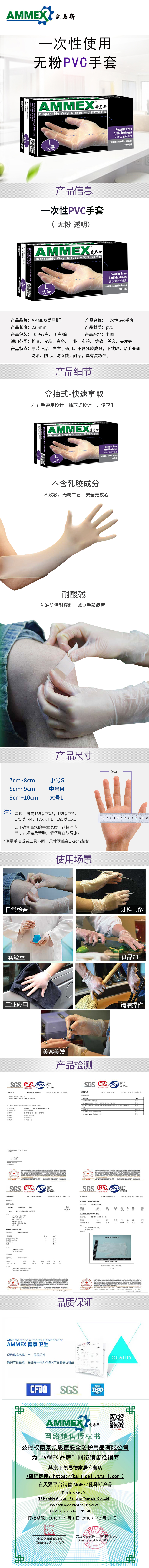 商品名称:AMMEX/爱马斯 食品级pvc手套一次性餐饮厨房烘培薄膜手膜透明手套 PVC