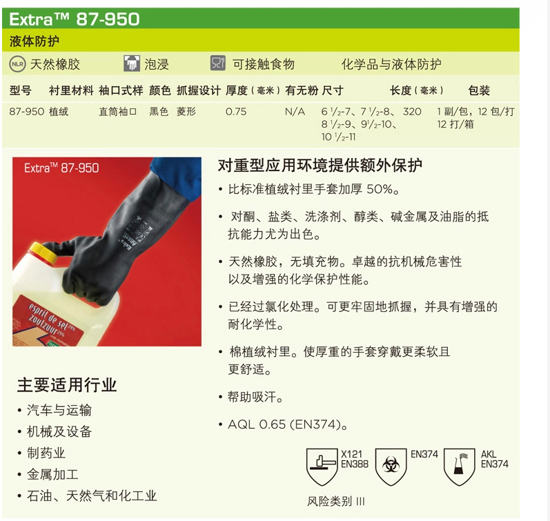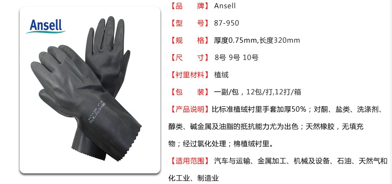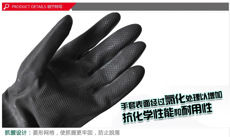 此款是工业用手套,主防酮,盐类,洗涤剂,醇类,碱金属及油脂等化学品防护性能出色,此款手套耐碱耐油,可接触食物。此款手套比一般手套要厚近一倍的,厚度0.75mm。加厚防水型。