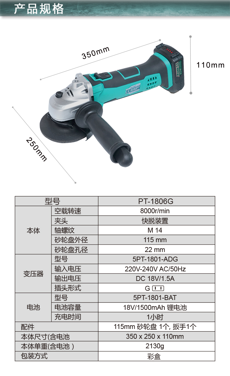 商品名称:宝工 18V锂电池角磨机 PT-1806G