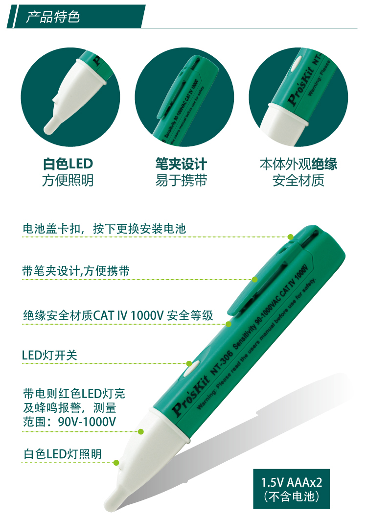 非接触式点笔, 使用安全,可量测交流电压90V~1000V