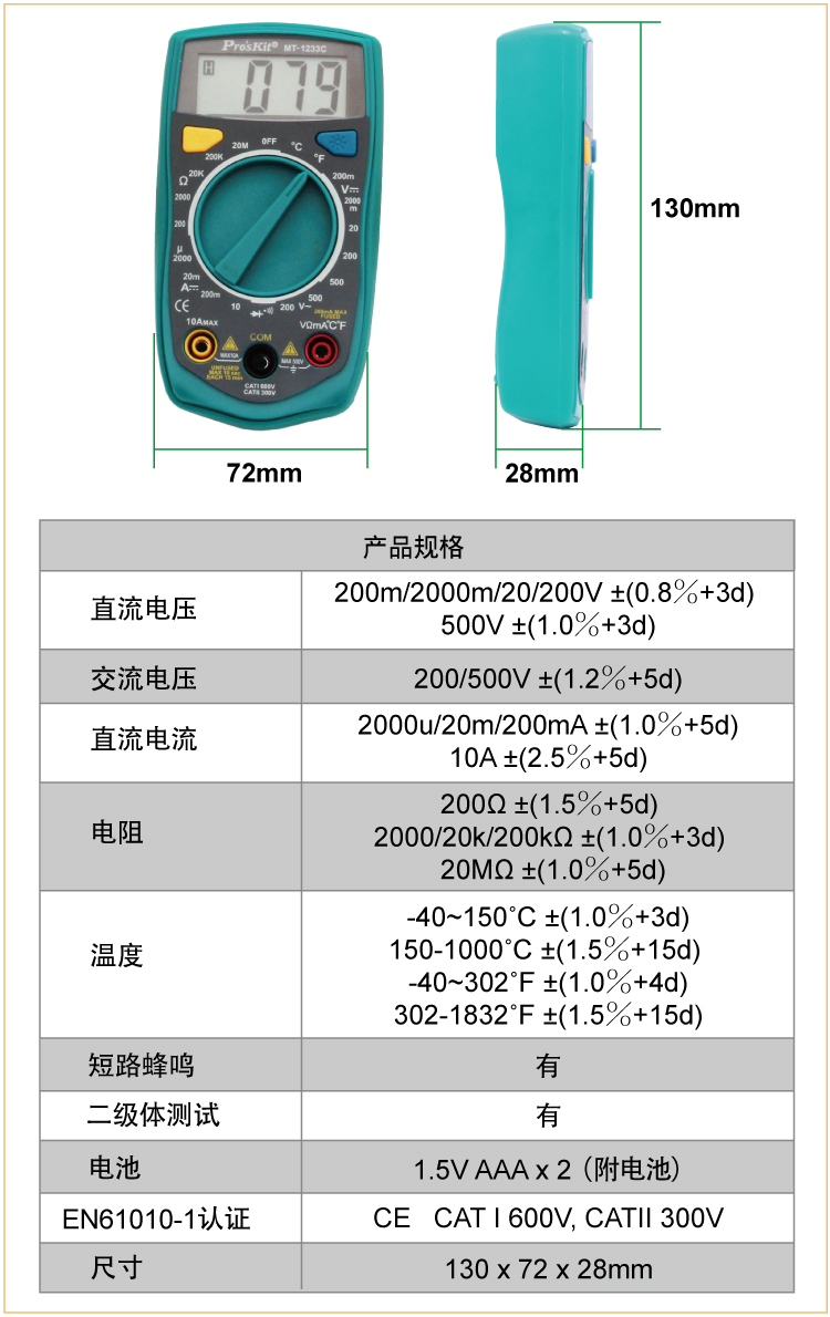 MT-1233C 3 1/2数位电表 带温度测试