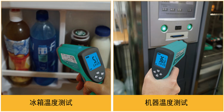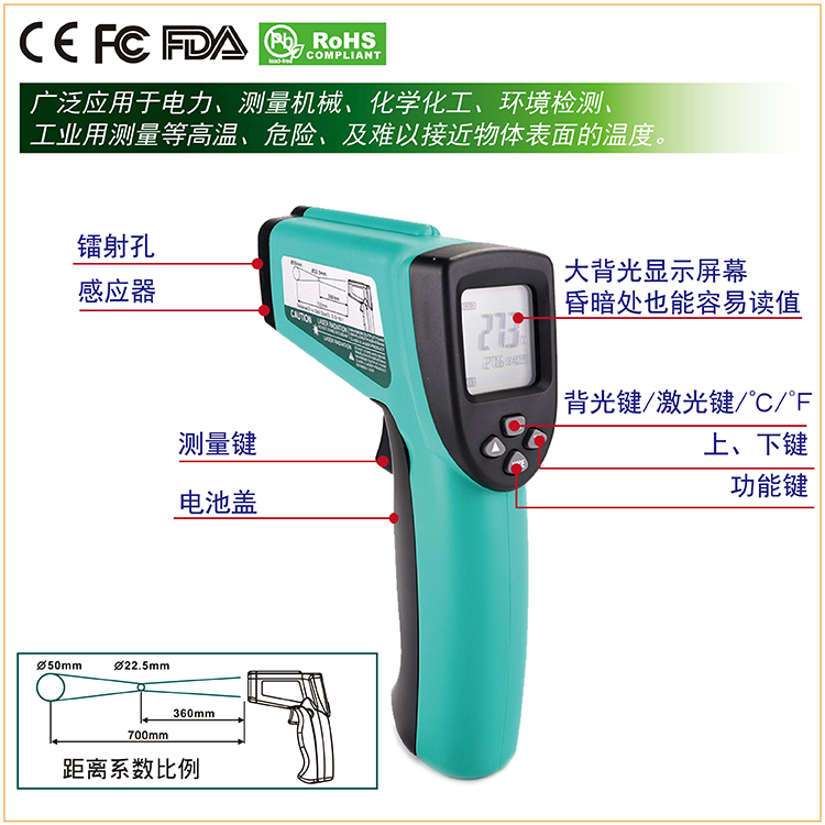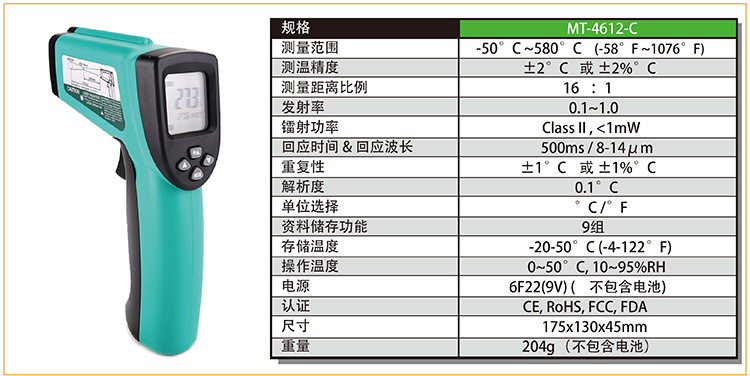 -50 to 580°C (-58°F ~1076°F) 温度测量范围 0.10 -1.00可调发射率 透过发射率的调整设定,在不同材质表面上也能准确测量 距离比例16:1 可在更远距离的地方就能轻松测量出目标物的温度