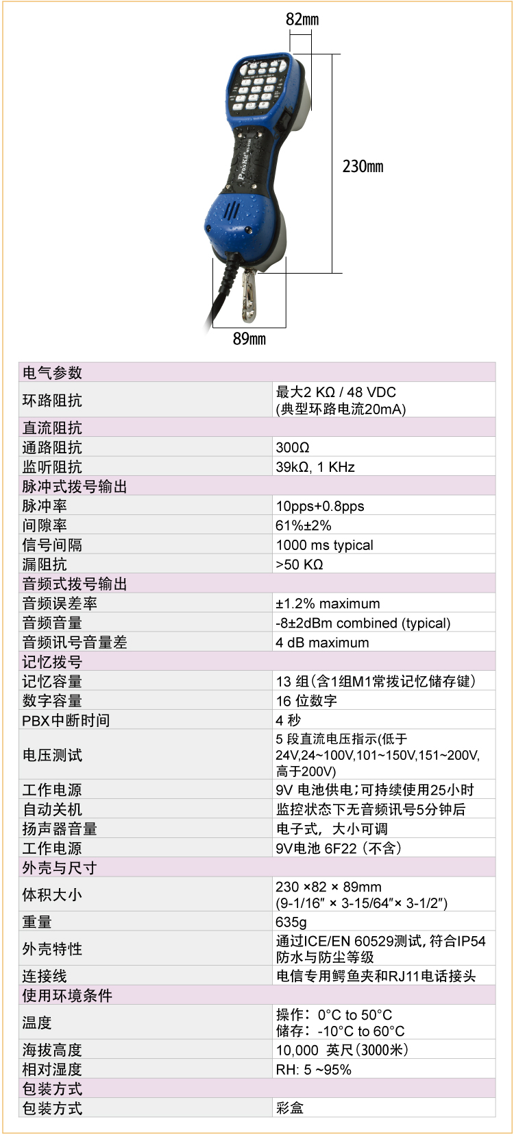 商品名称:宝工 防水型电话测试器 电话机 电信查线机 测试电话 MT-8100