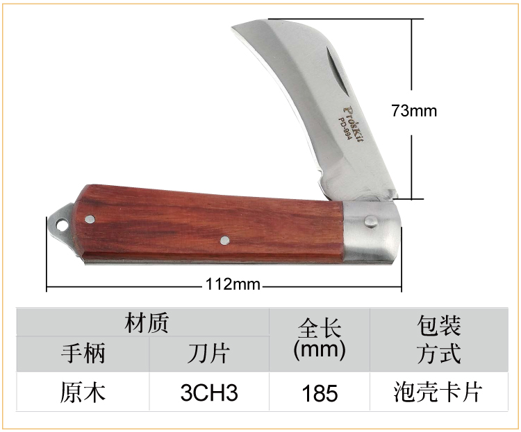 商品名称:宝工 不銹钢电工刀 弯刃电工刀具 剥线刀 木柄 折叠刀 PD-994