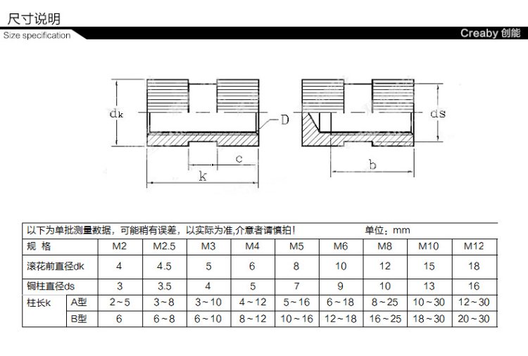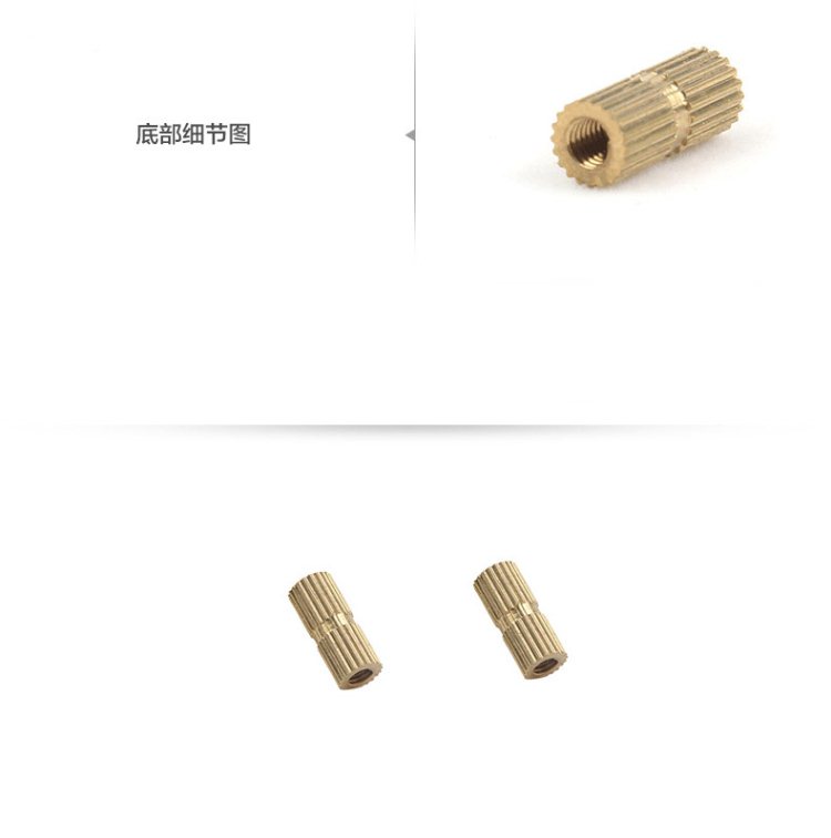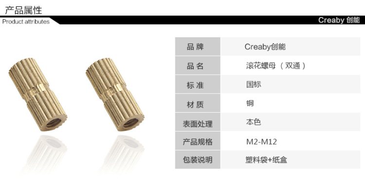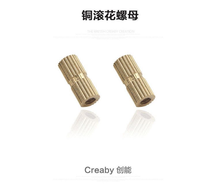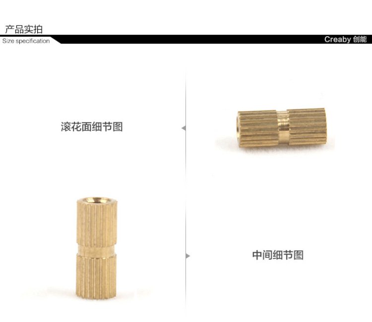 商品名称:Creaby/创能 100只 双通铜花母 滚花注塑预埋铜镶嵌件 家具圆筒螺母 M3
