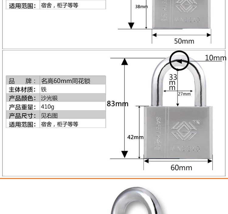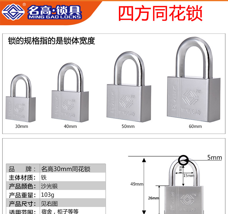 商品名称:名高 家用统开锁通用型防水防锈防盗互开挂锁四方同花锁头通开宿舍