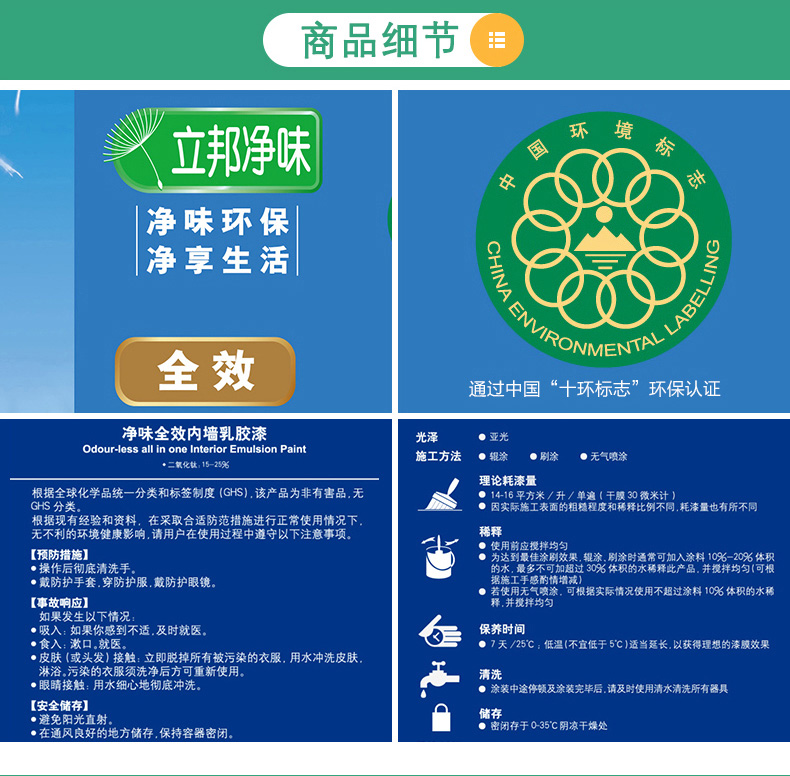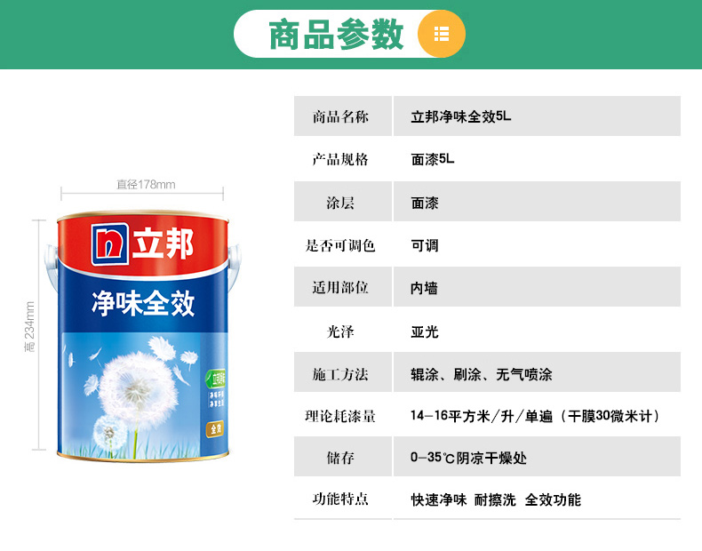商品名称:立邦漆 净味全效 室内乳胶漆 墙漆白色刷墙涂料 环保墙面漆5L