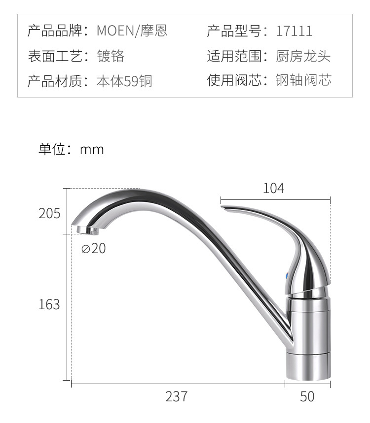 商品名称:摩恩 铜体厨房龙头 单孔冷热水可旋转水槽洗菜盆 水龙头 17111