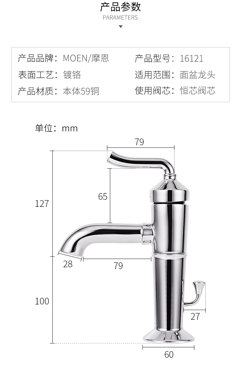 商品名称:摩恩 水龙头新古典单把手冷热龙头洗脸台面盆龙头洗手池水嘴 16121