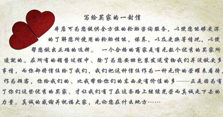 (3)轮胎发出后我们会上传货运单号、买家可在网上进行货物跟踪;收到轮胎后。请及时确认收货,并给予评价;我们非常期待和重视你的好评。力争做到服务上的完美。如果你收到货时有任何不妥;请速与我联系相信我们一定会给你满意的答复;祝你购物愉快