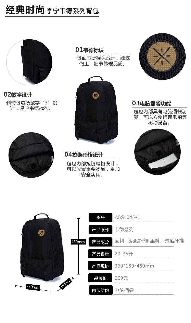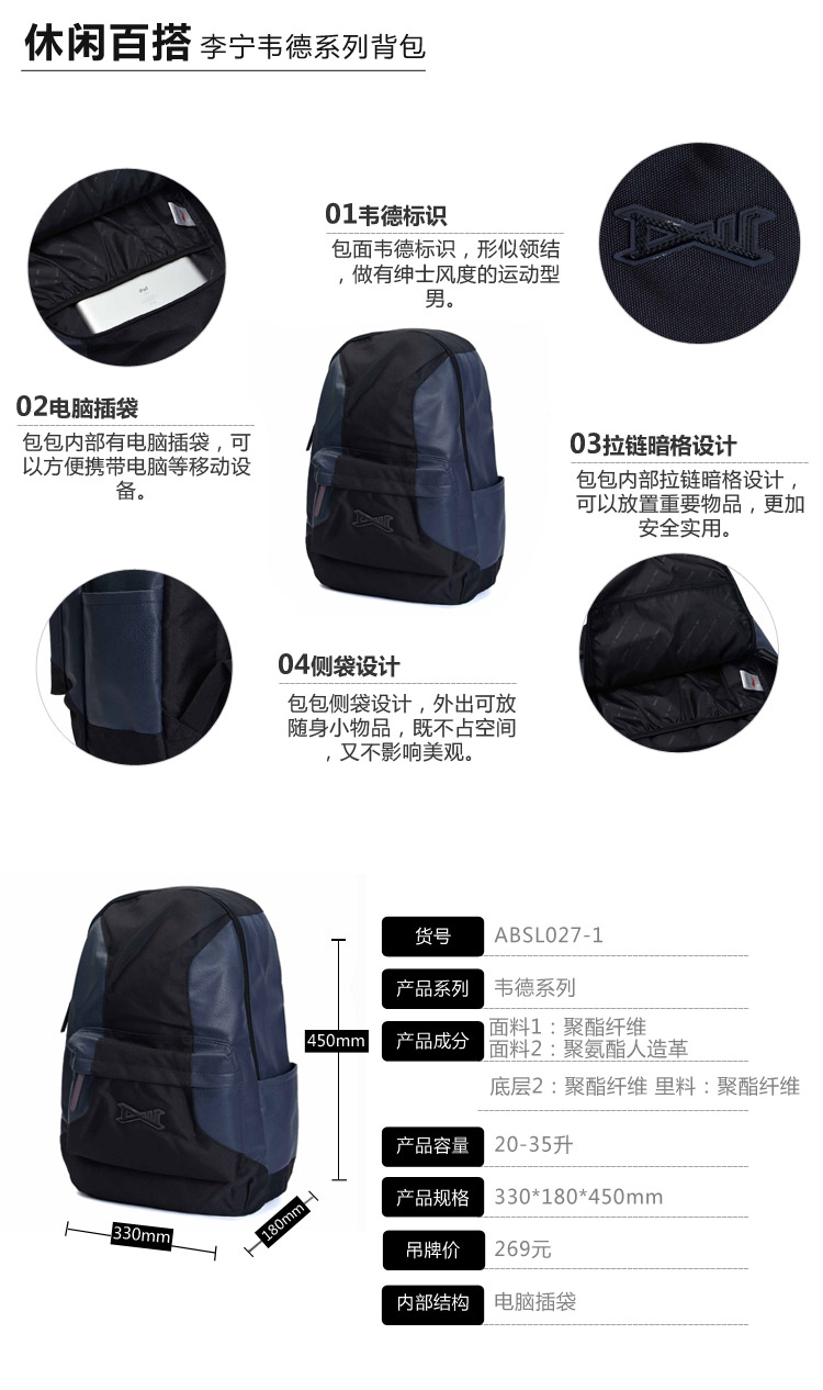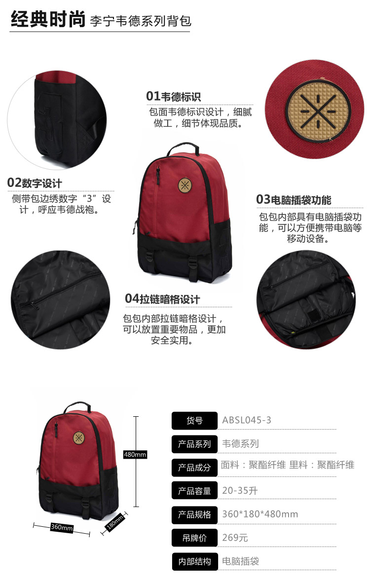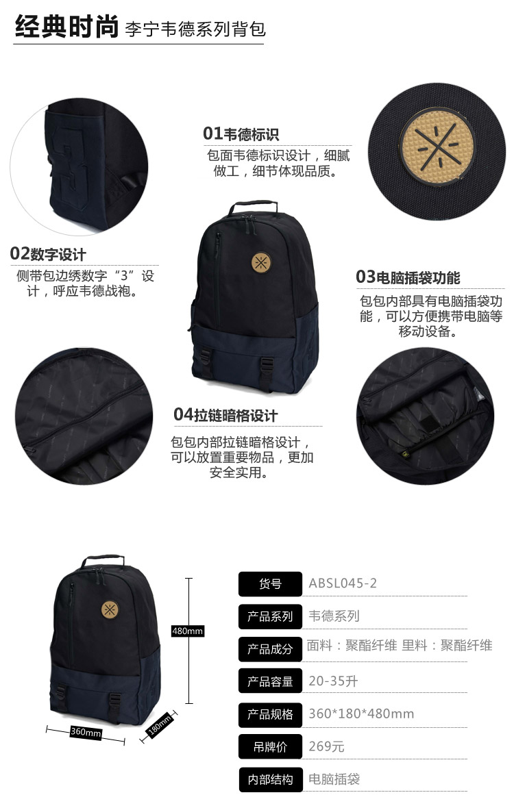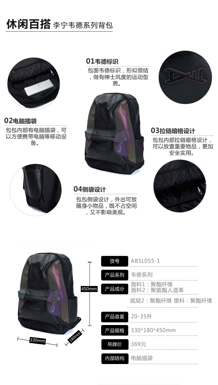 商品名称:李宁 背包男包韦德之道双肩包大容量 ABSL055