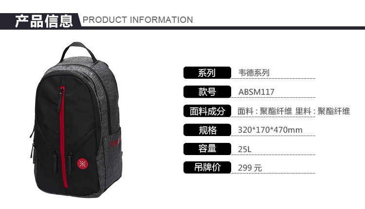 商品名称:中国 李宁双肩包背包书包运动包电脑包大 ABSM117