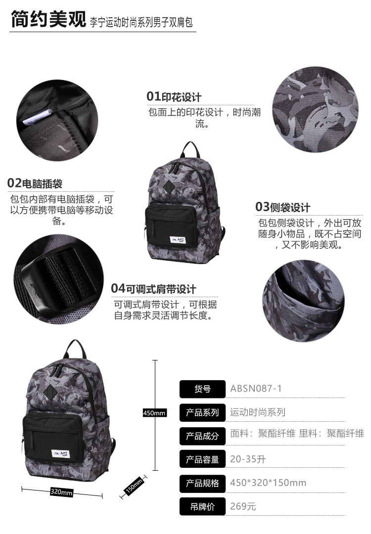 商品名称:李宁 双肩包男运动时尚背包书包学生电脑包运动包ABSN087