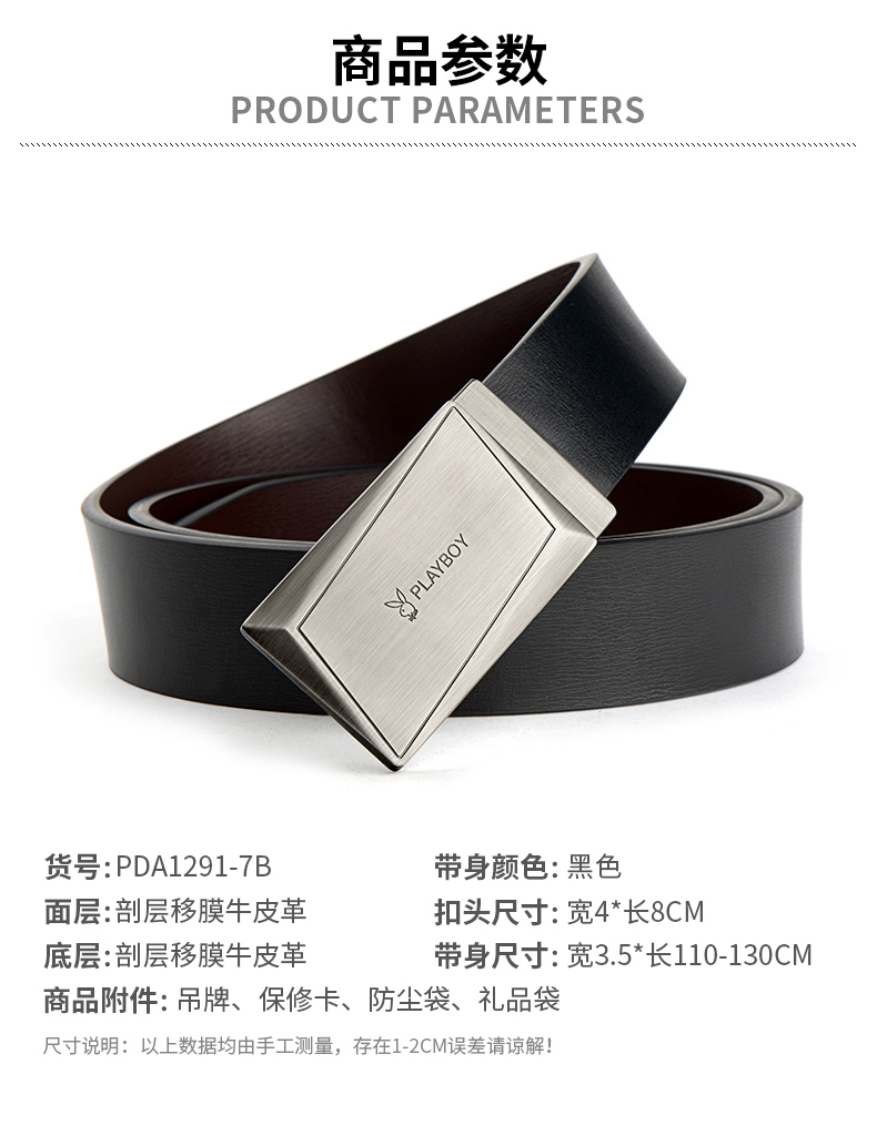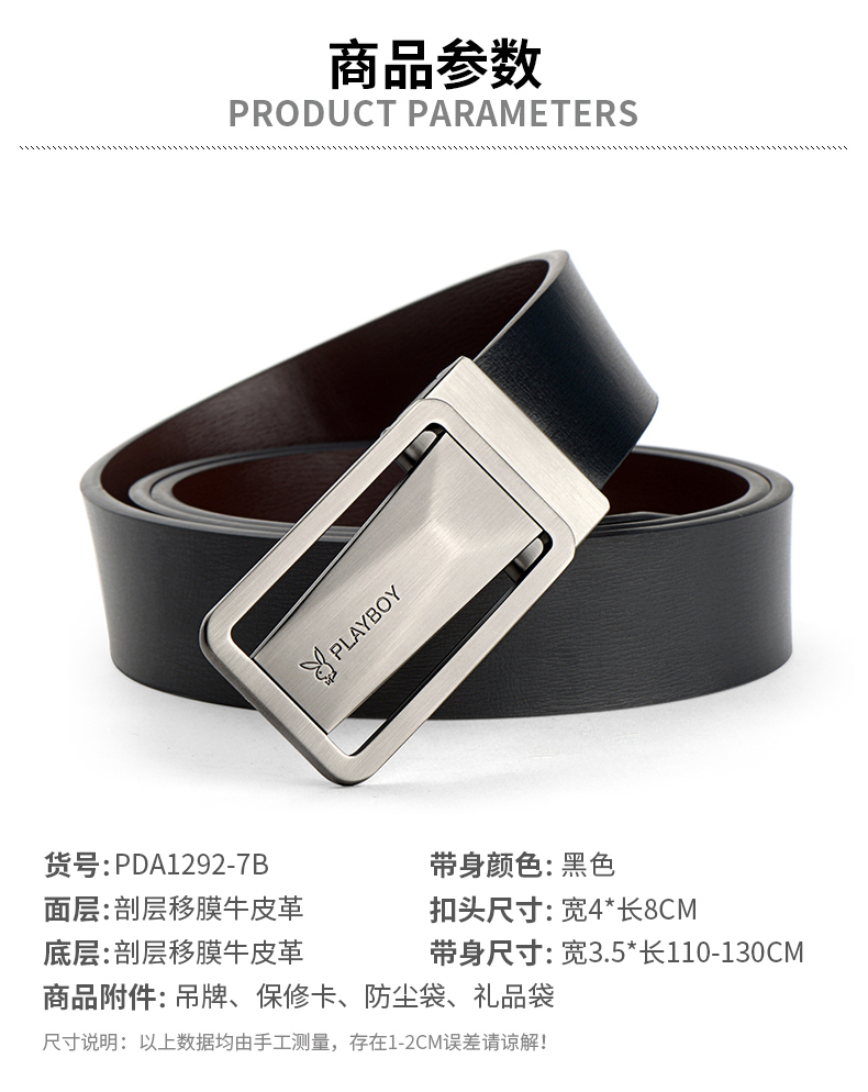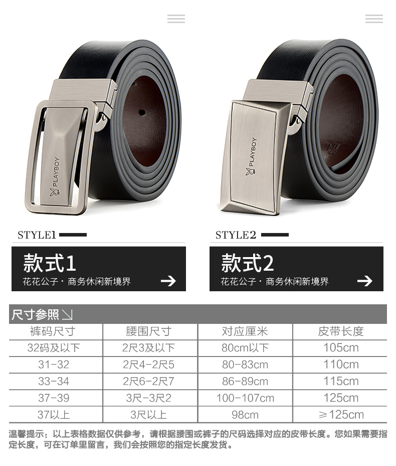 商品名称:花花公子 皮带男真皮平滑扣商务休闲裤带合金板扣牛皮青年韩版腰带