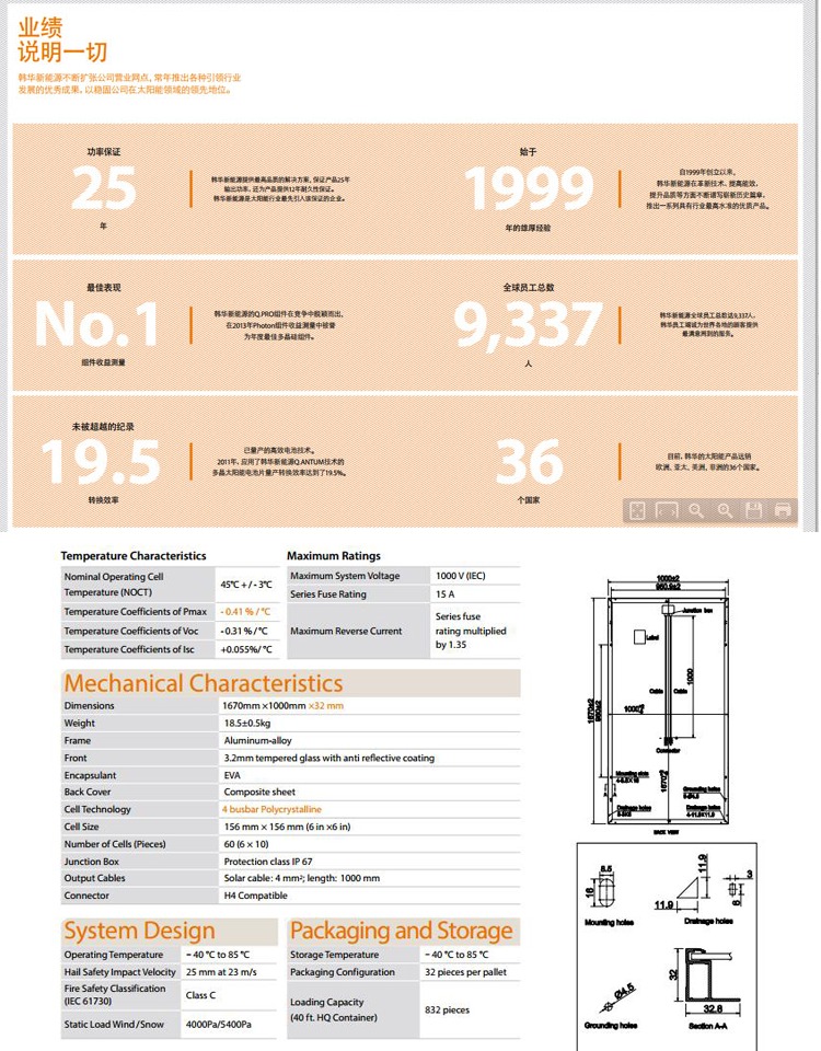 商品名称:韩华 A多晶家用电站分布式并网发电光伏板原厂质保25年 270W