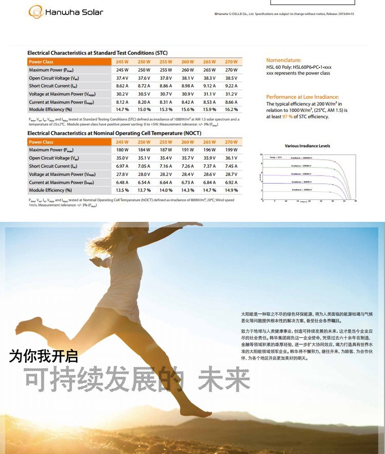 韩华 A多晶家用电站分布式并网发电光伏板原厂质保25年 270W