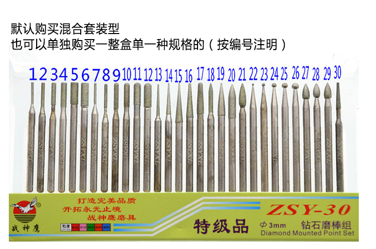 商品名称:战神鹰 金刚石磨头 30支装 3mm柄磨针 30pcs钻石磨棒 合金磨头