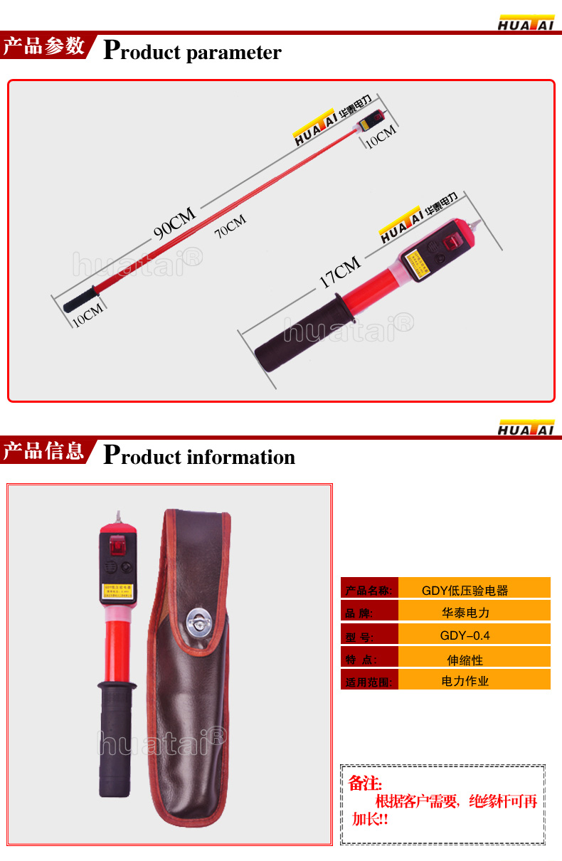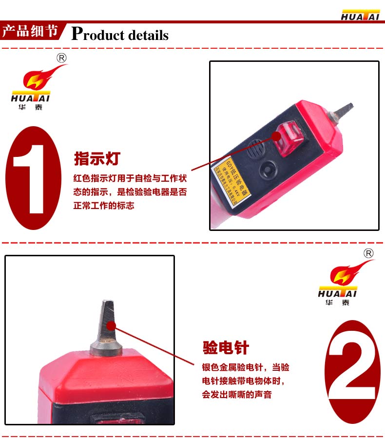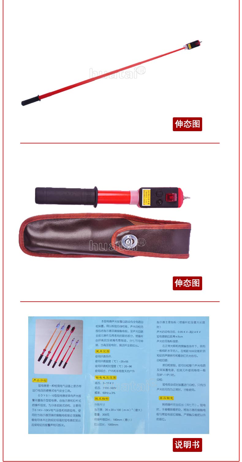 一、概况: 该验电器是电力系统及工矿企业用电作业必备的安全工具,它用于检测线路或设备是否带有运行工频电压,以确保在停电检修的工作人员的人身安全。石家庄华泰电力工具有限公司公司生产声光验电器,有多个电压等级产品,供用户按实际运行电压等级选择订货。验电时它即发出声和光双重报警信号,以提示工作人员被检线路或设备带电。 该验电器在电力工业电力安全工器具检测中心通过型式试验,主要技术指标符合DL740-2000电力行业标准及国际IEC技术标准。产品通过省级鉴定并经电力工业审查,同意在全国推广使用。