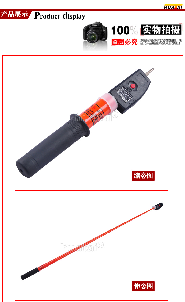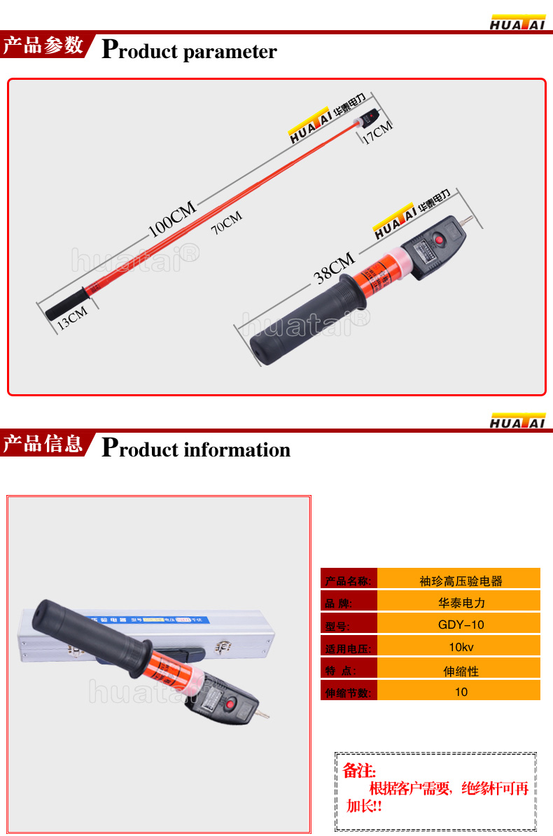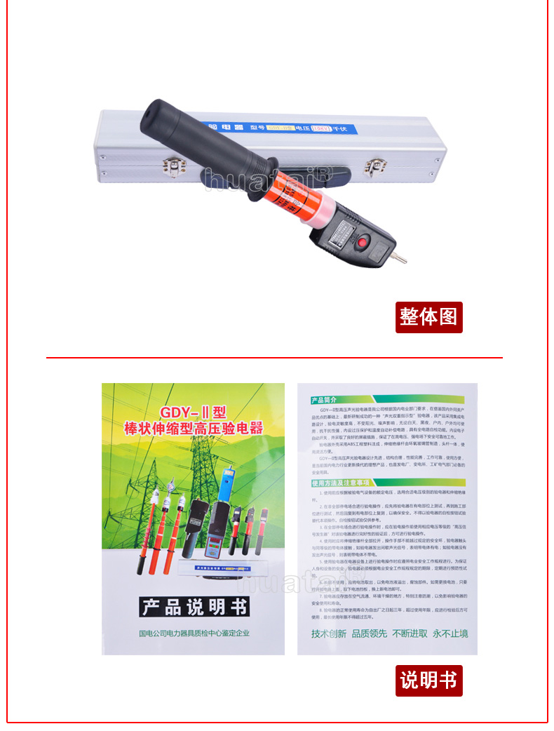 一、概况:该验电器是电力系统及工矿企业用电作业必备的安全工具,它用于检测0.1kV-500kV线路或设备是否带有运行工频电压,以确保在停电检修的工作人员的人身安全。石家庄华泰电力工具有限公司公司生产GDY-II型声光验电器,分为0.1kV至500kV七个电压等级产品,供用户按实际运行电压等级选择订货。验电时它即发出声和光双重报警信号,以提示工作人员被检线路或设备带电。该验电器在电力工业电力安全工器具检测中心通过型式试验,主要技术指标符合DL740-2000电力行业标准及国际IEC技术标准。产品通过省级鉴定并经电力工业审查,同意在全国推广使用。