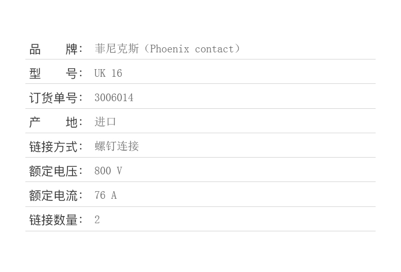商品名称:菲尼克斯 接线端子螺钉连接0.5-16 平方 UK 16-3006014