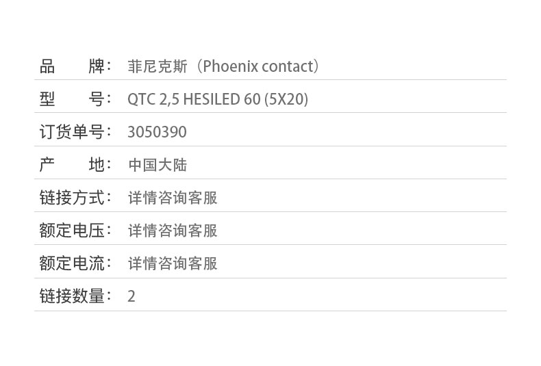 商品名称:菲尼克斯 端子2.5平方 QTC 2.5 HESILED 60 (5X20)-3050390