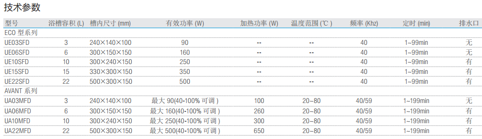 型号 | 浴槽容积(L) | 槽内尺寸 (mm) | 有效功率(W) | 频率(Khz) | 定时(min) | 排水口 |