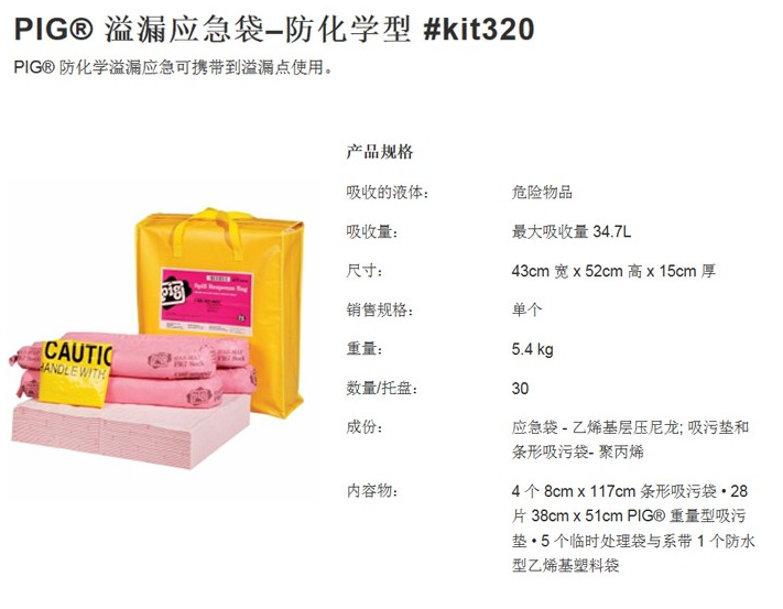 商品名称:NewPig/纽匹格 kit320 防溢漏应急袋–防化学型 化学品应急包 吸酸碱套装