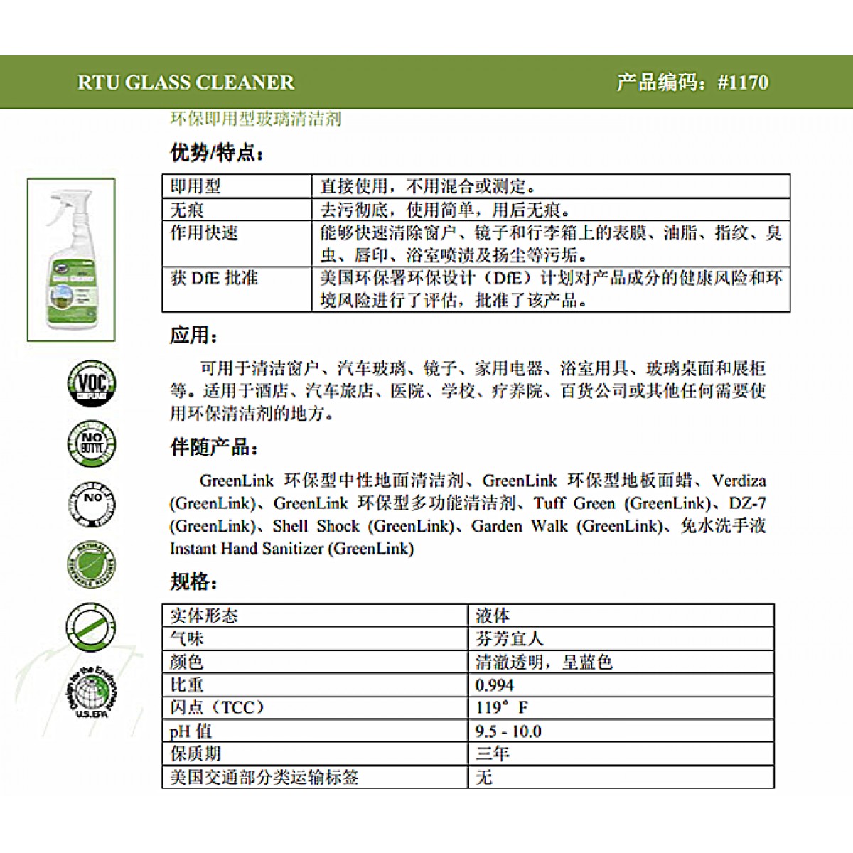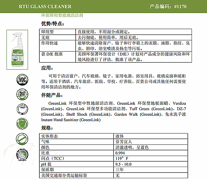 商品名称:ZEP/洁普 玻璃清洁剂 绿色环保 去污除尘 物理分解