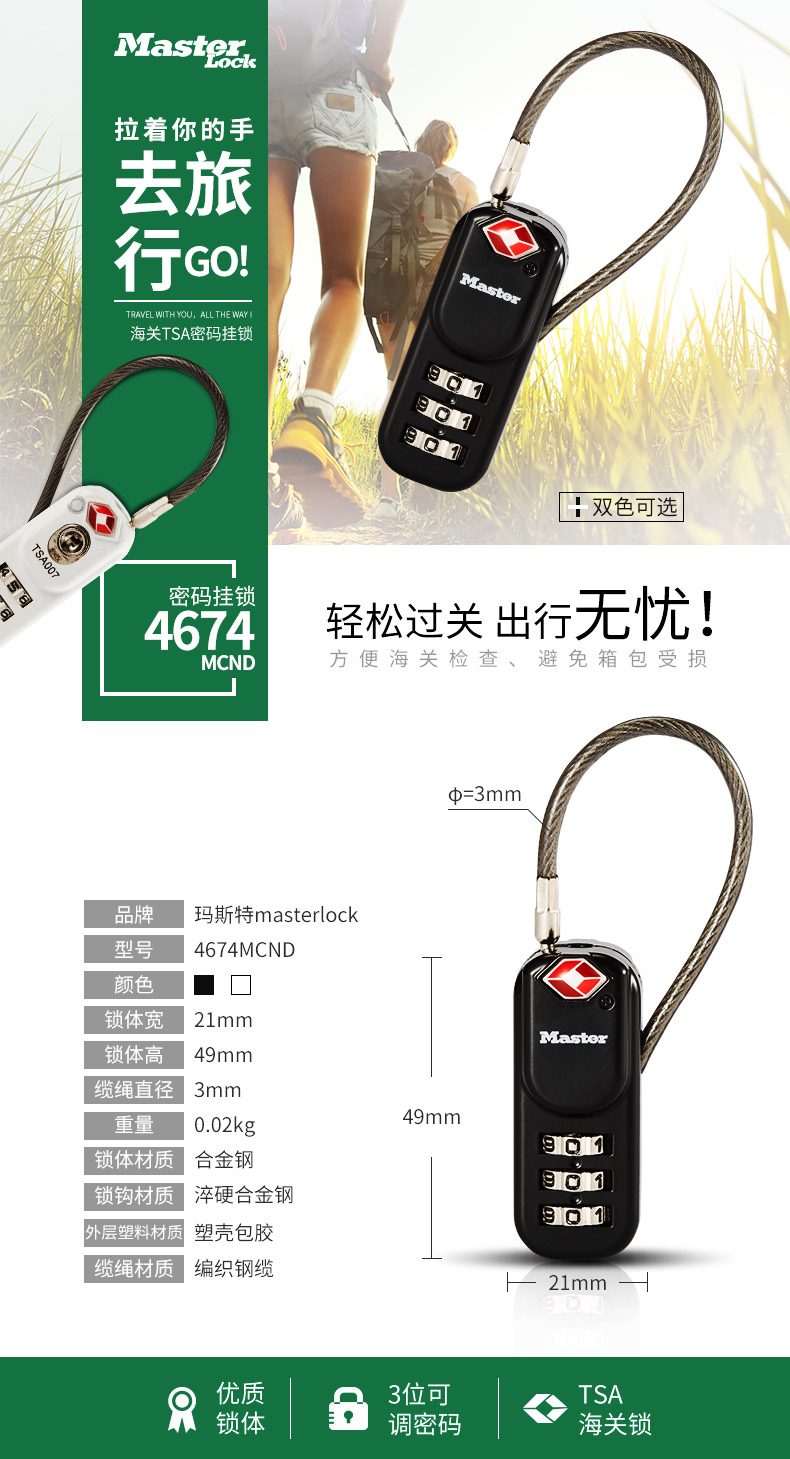 玛斯特 出国旅行tsa钢丝密码锁海关锁行李箱拉杆箱皮箱包挂锁 4674MCND