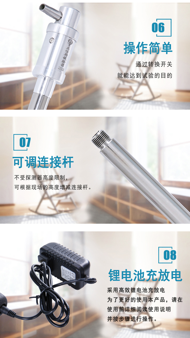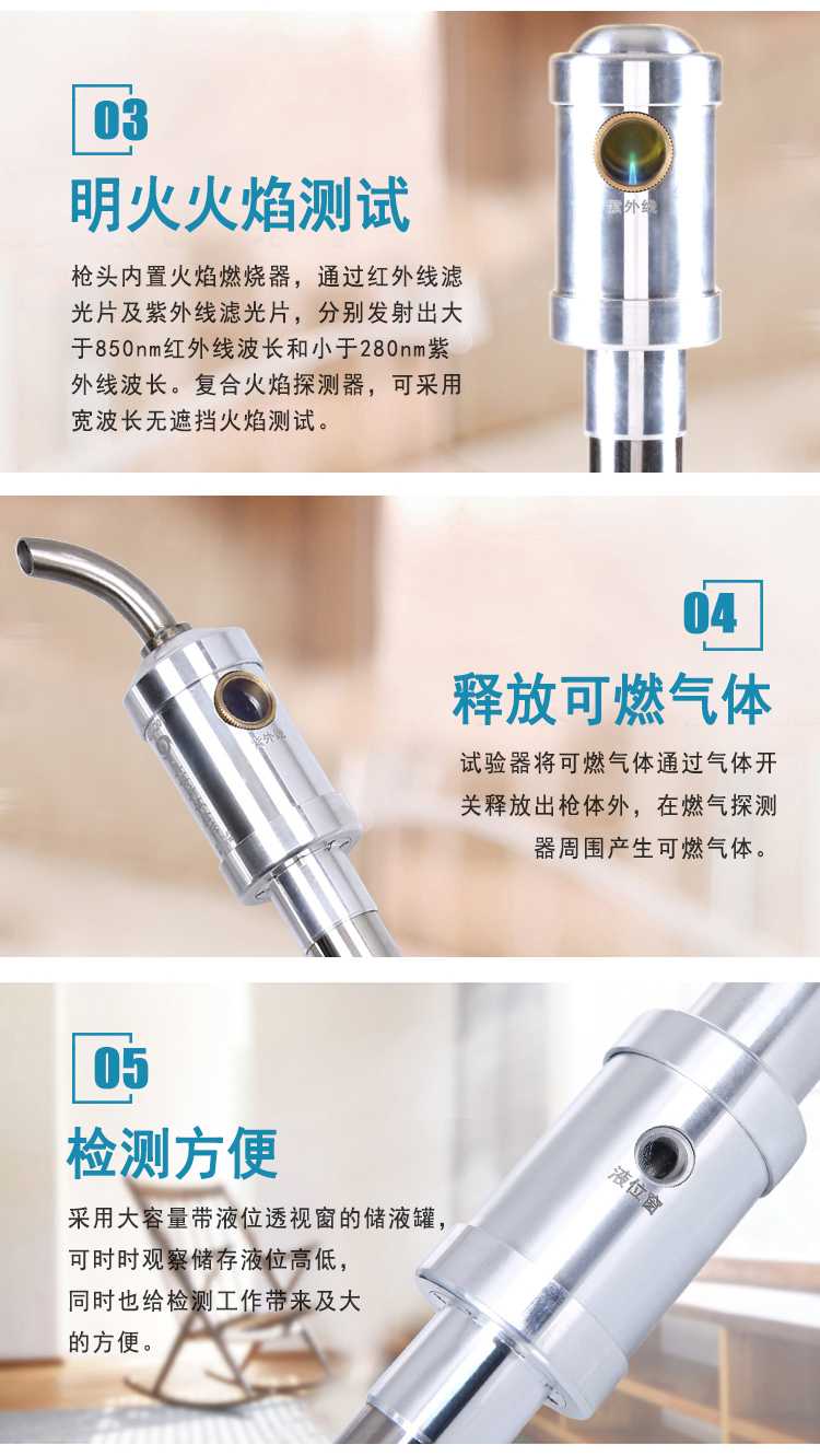 *感温测试,采用电子式和气体式二种可选加温。A枪头电子式加温,为无明火发热,采用电子能量转换技术,短时间内可达150度以上。适应于感温探测器类别A1、A2、B、C、D。