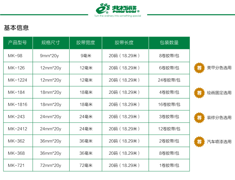 商品名称:北极熊 美纹纸胶带易撕不留痕汽车喷漆美术生专用贴边瓷砖美缝手撕和纸胶布装修MK-98MK-126MK-184 9mm*20y