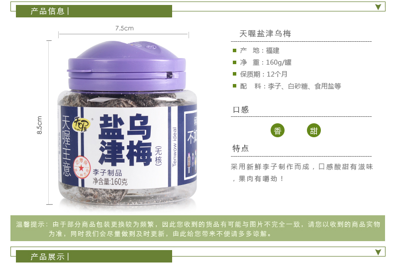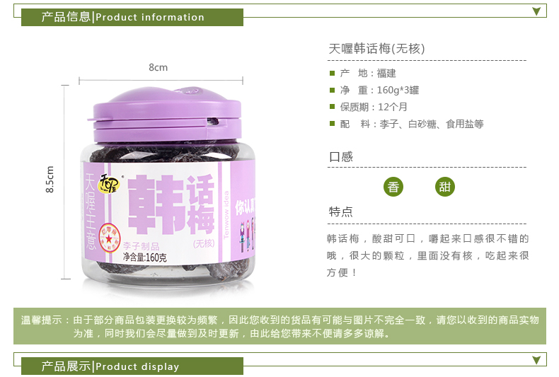 商品名称:天喔主意 无核话梅梅子蜜饯果脯 天喔韩话梅160g*3罐 休闲零食