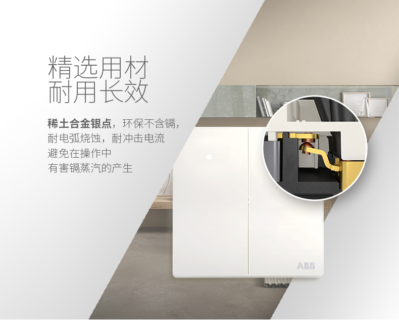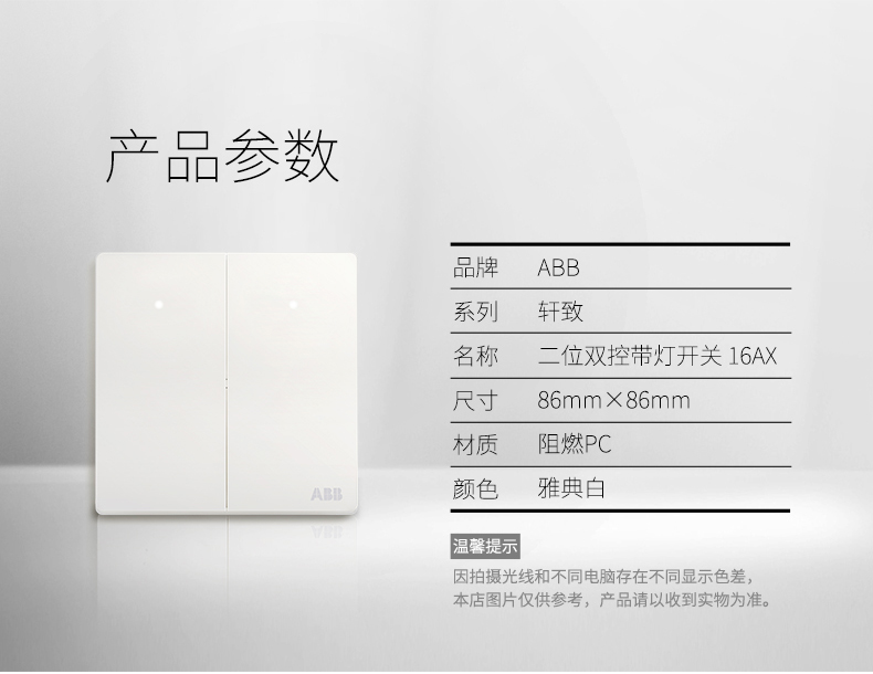 商品名称:ABB 开关二开面板轩致无框雅典白色系列二位双控带LED指示灯AF168