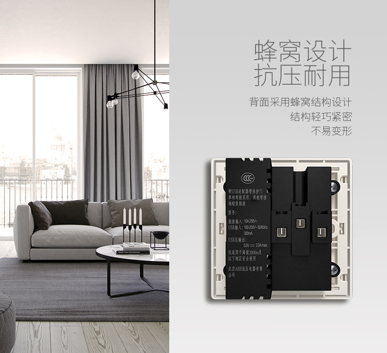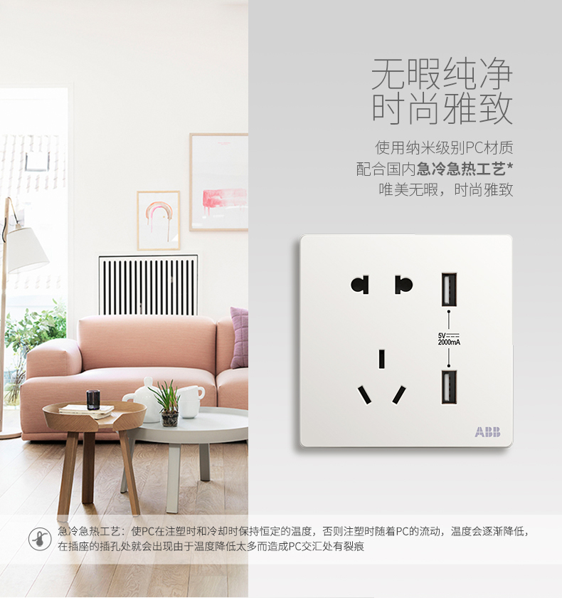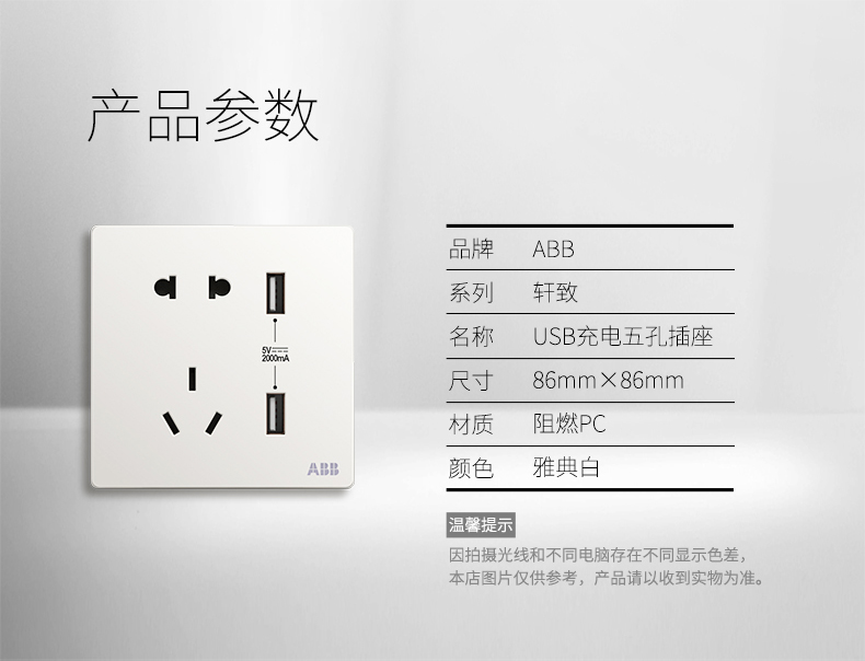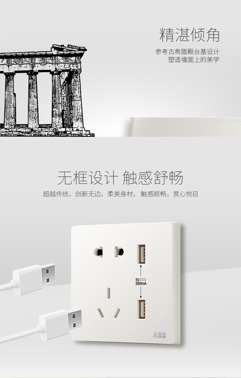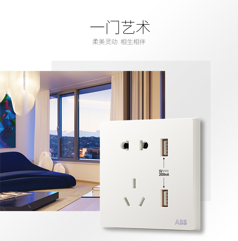 商品名称:ABB 开关插座面板轩致无框雅典白色10A五孔带双USB充电二三插AF293