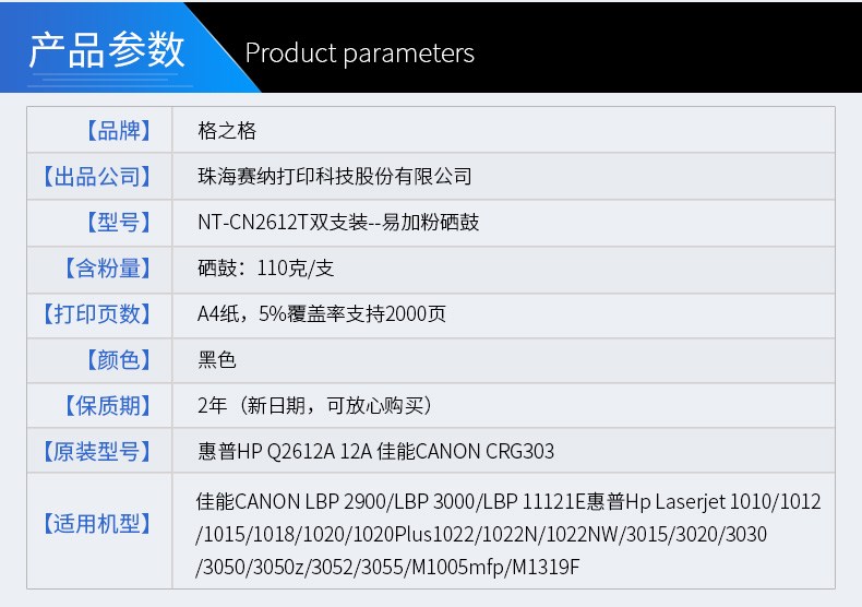 商品名称:格之格 2612T 易加粉硒鼓适用惠普HP1020 1018佳能LBP2900墨盒晒鼓