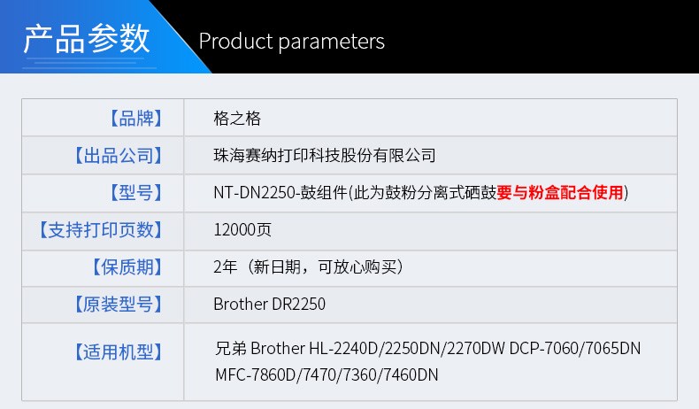 商品名称:格之格 DN2250 鼓组件适用兄弟HL-2240D MFC-7360 7060 DR-2250鼓架