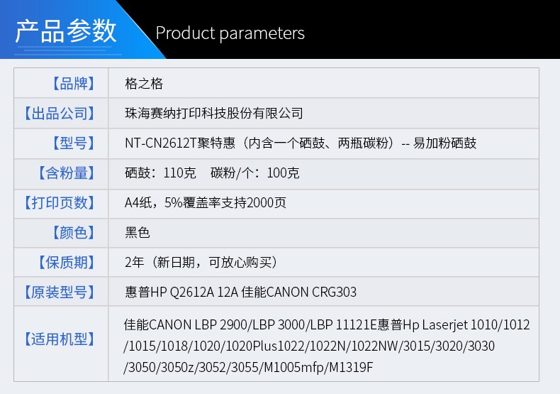 商品名称:格之格 适用易加粉 HP12A 硒鼓 Q2612A HP1020佳能打印机 Lbp2900 3000墨盒