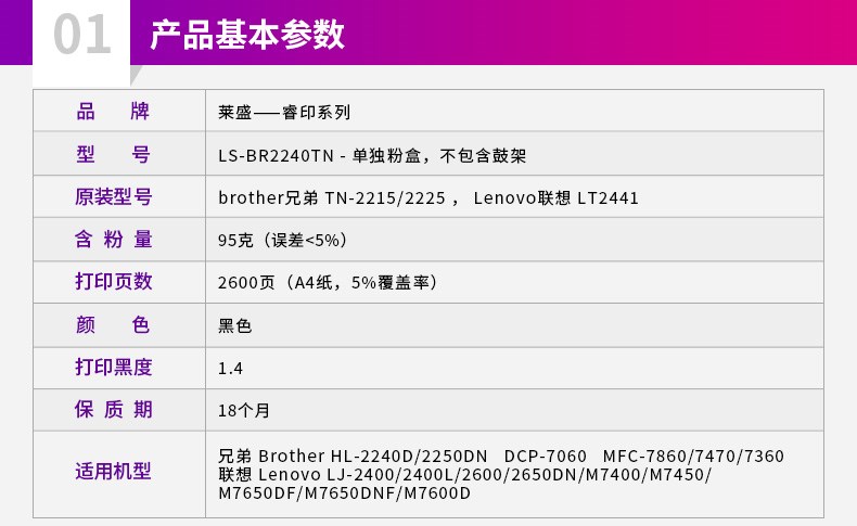 商品名称:莱盛 LS-BR2240 粉盒 适用兄弟TN-2215硒鼓 tn2225联想 lenovo 2441墨盒