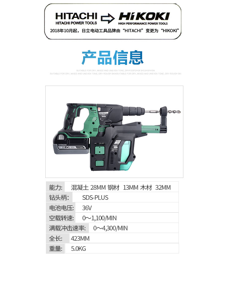 商品名称:日立 充电电锤 无刷吸尘式电锤 工业级无线锤钻冲击钻 DH36DBML