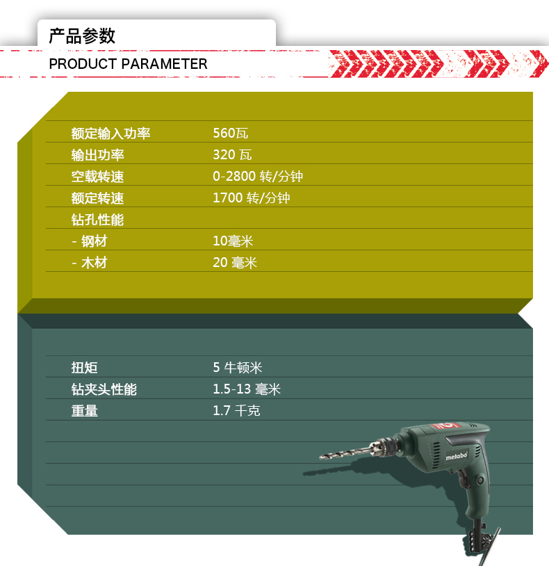 商品名称:Metabo/麦太保 13毫米手电钻螺丝起子机多功能正反调速 BE561