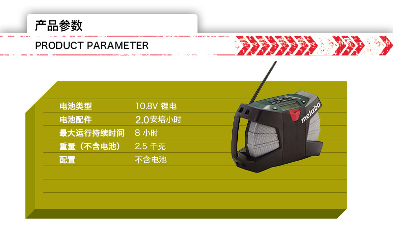 商品名称:Metabo/麦太保 Wild Cat霹雳猫锂电池播放器手机充电器收音机 RC12